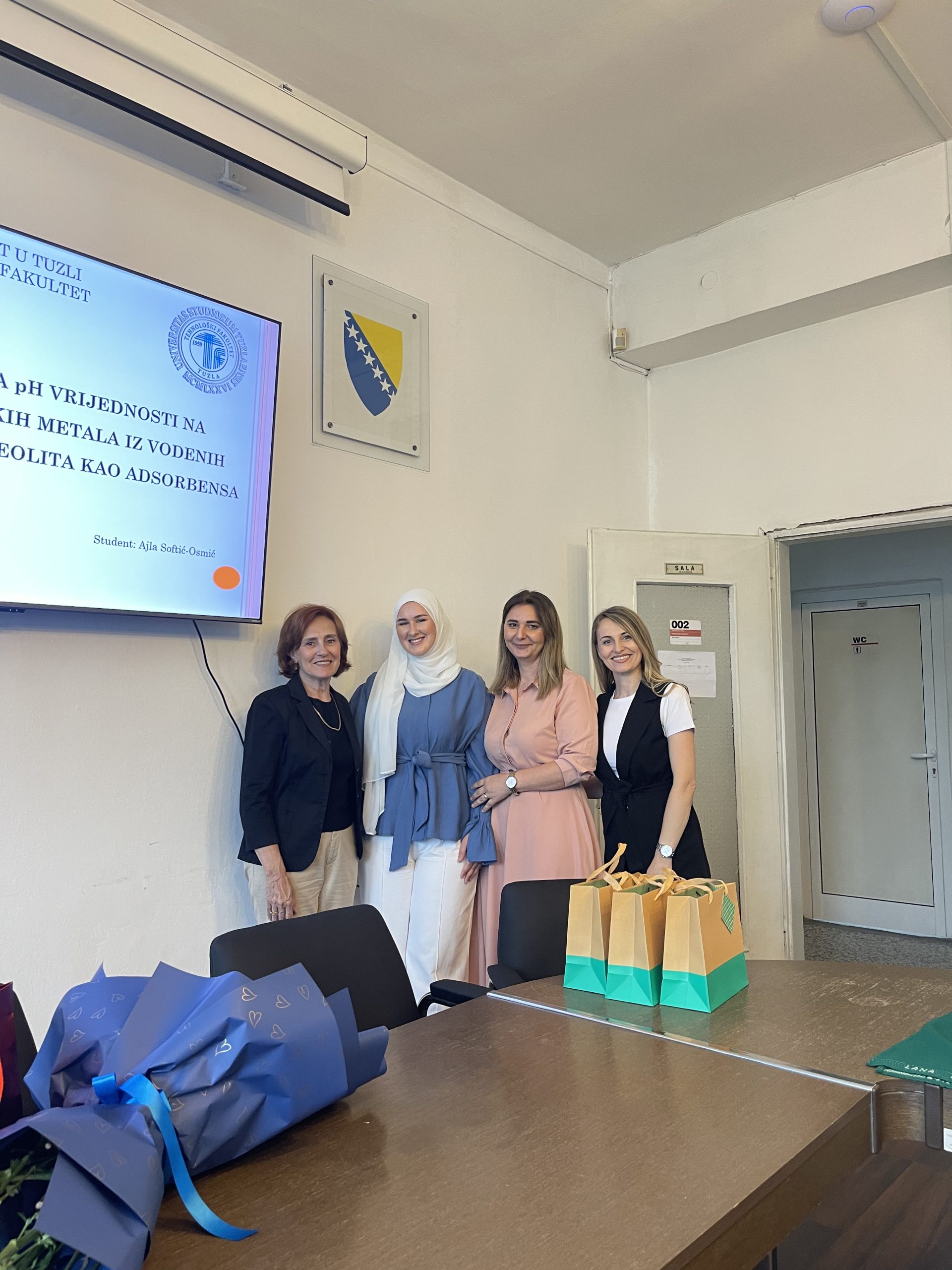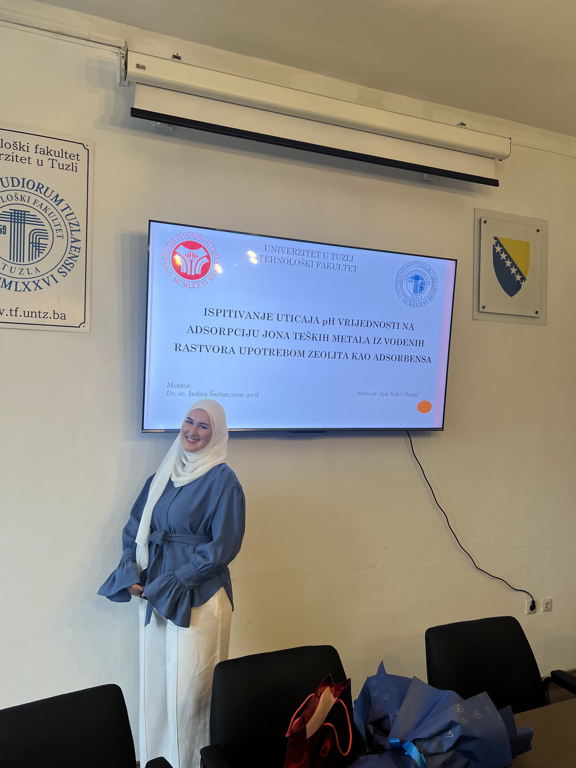 Dana 17.07.2025. godine na studijskom odsjeku Hemijsko inženjerstvo i tehnologija (usmjerenje Hemijsko inženjerstvo i tehnologije), naša kolegica Ajla Softić je uspješno odbranila svoj završni rad prvog ciklusa studija pod nazivom „Ispitivanje uticaja pH vrijednosti na adsorpciju jona teških metala iz vodenih rastvora upotrebom zeolita kao adsorbensa“, pred Komisijom za odbranu u sljedećem sastavu: