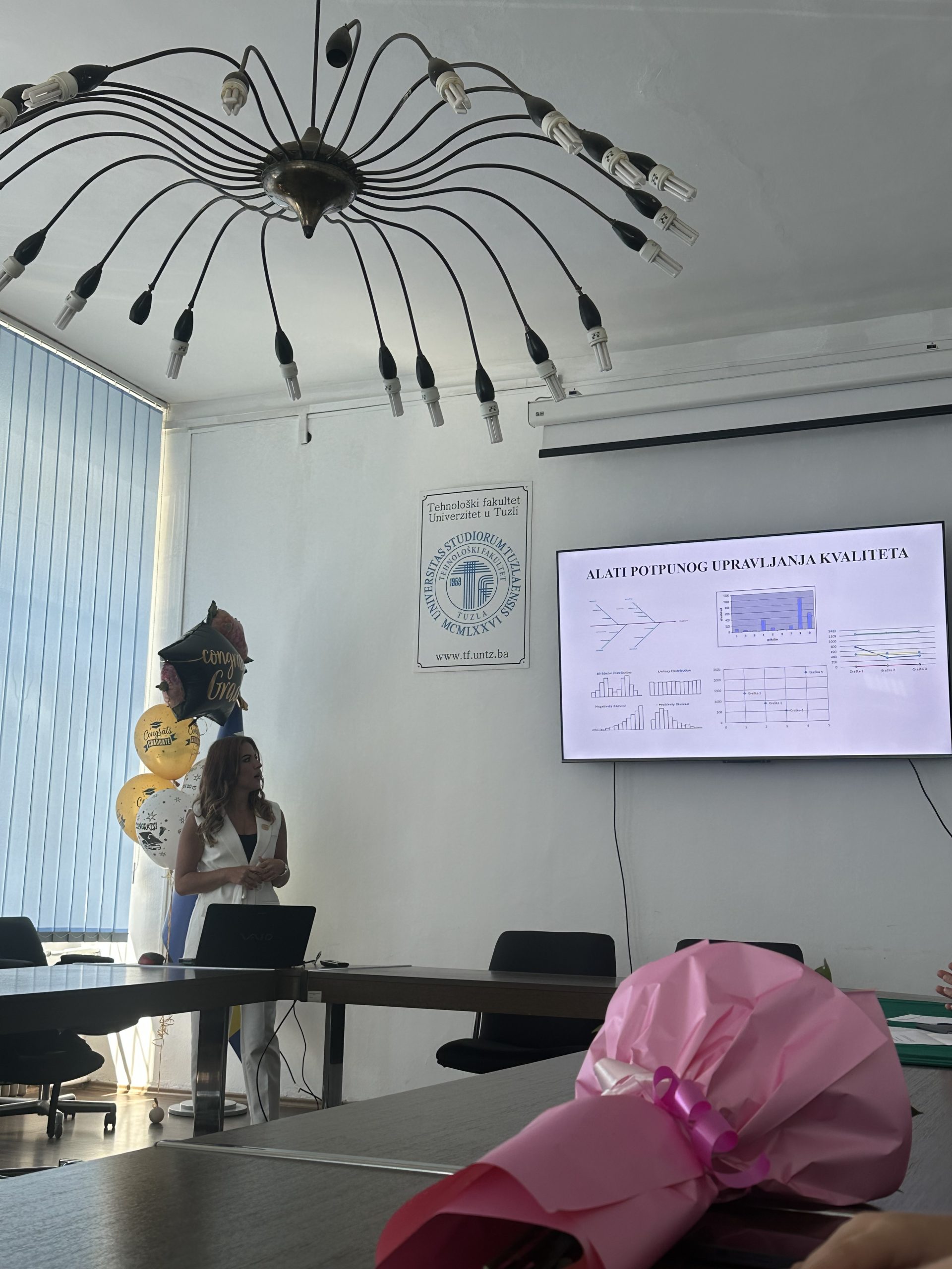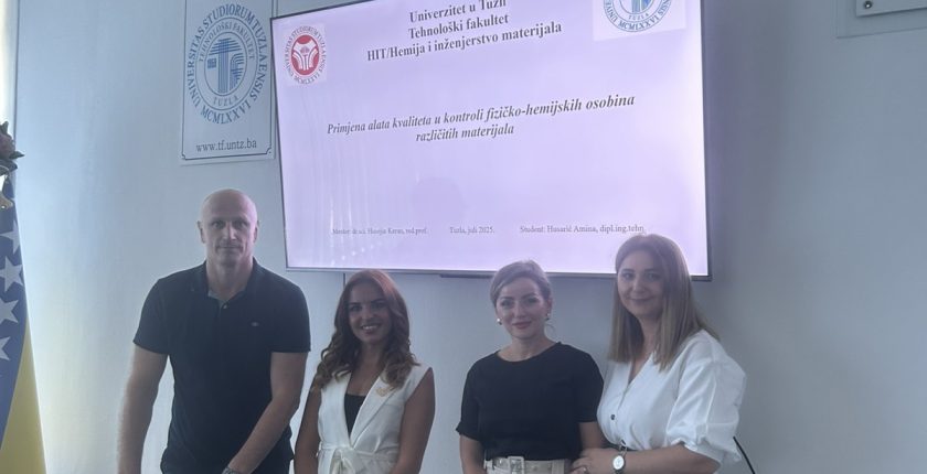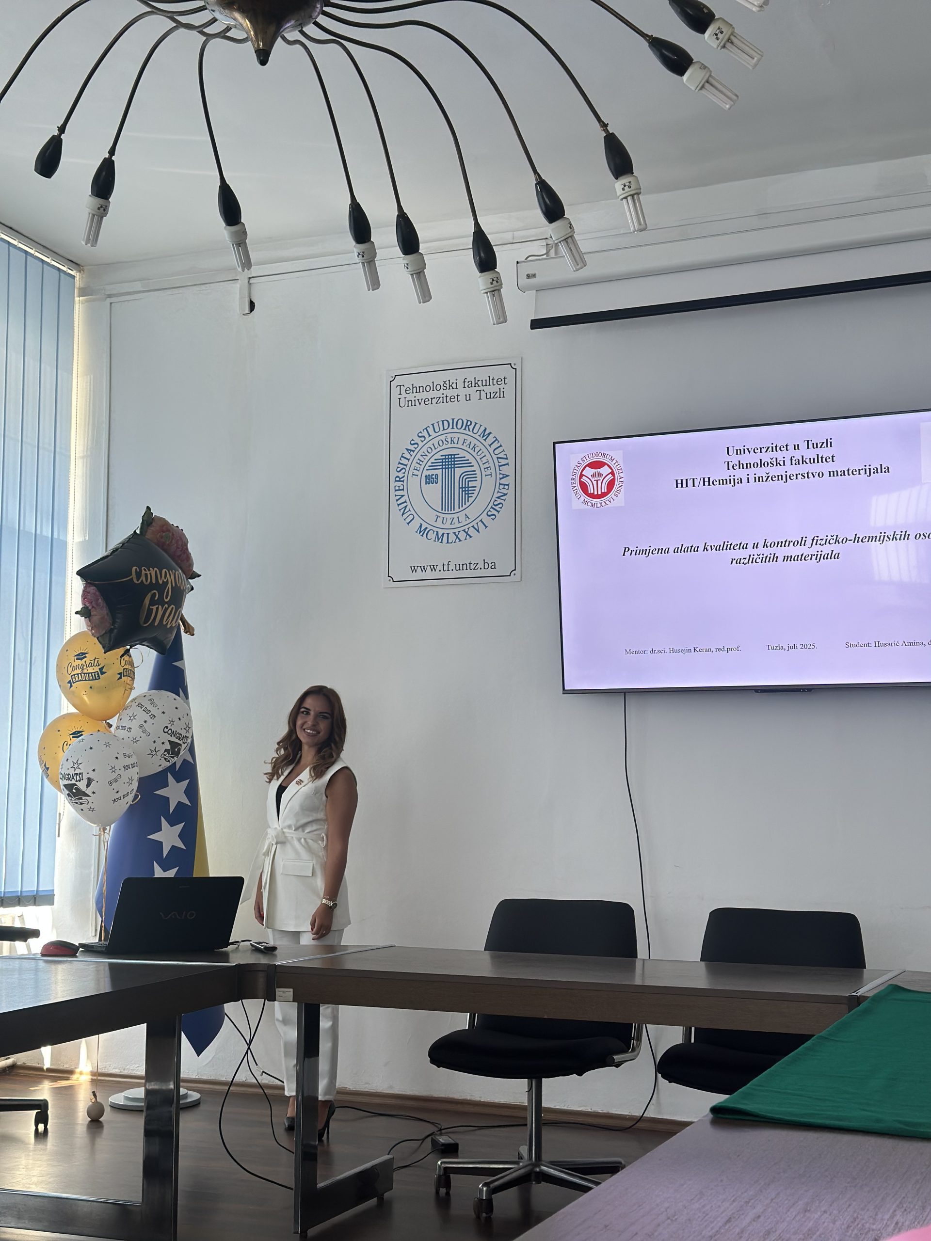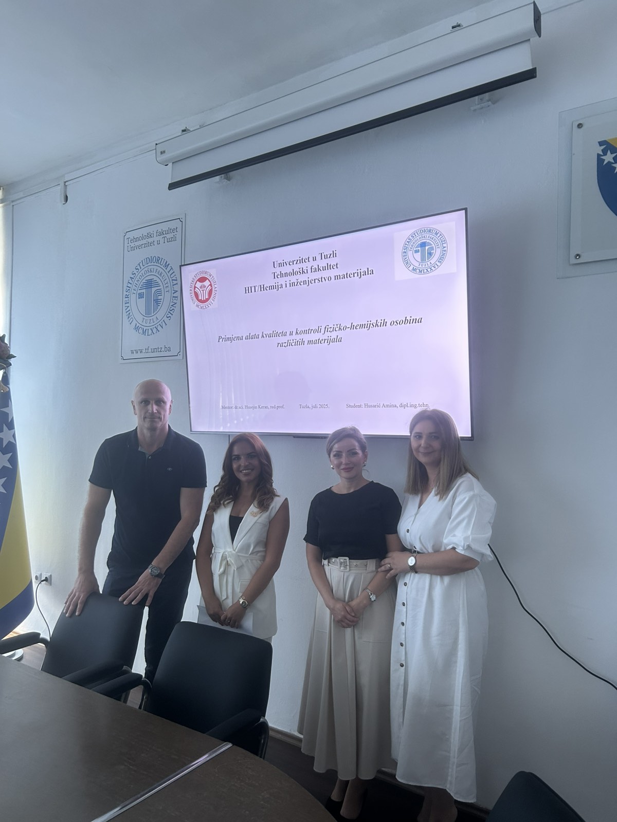 Dana 18.07.2025. godine na drugom ciklusu studija – studijski program Hemijsko inženjerstvo i tehnologija, usmjerenje Hemija i inženjerstvo materijala, naša kolegica Amina Husarić, bachelor-inženjer hemijskog inženjerstva i tehnologije, uspješno je odbranila svoj završni magistarski rad pod nazivom „Primjena alata kvaliteta u kontroli fizičko-hemijskih osobina različitih materijala“, pred Komisijom za odbranu u sljedećem sastavu: