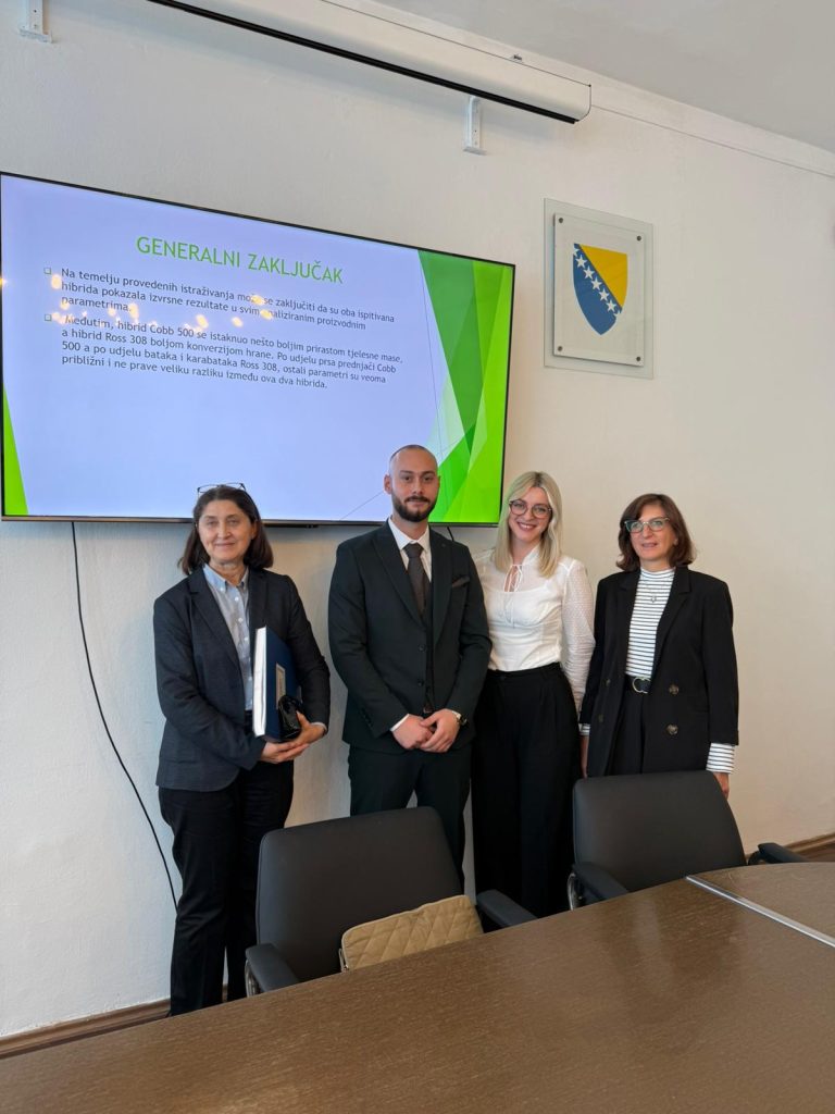 Dana 24.10.2025. godine na studijskom programu Prehrambena tehnologija (usmjerenje Prehrambena tehnologija), naš kolega Dženan Mulahusejnović uspješno je odbranio završni rad prvog ciklusa studija pod nazivom “Uticaj hibrida pilića u tovu na proizvodne parametre” pred Komisijom za odbranu u sljedećem sastavu: – Dr.sc. Milica Vilušić, redovni profesor, predsjednik – Dr.sc. Dijana Miličević, redovni profesor, zamjenski član – MA Amela […]
