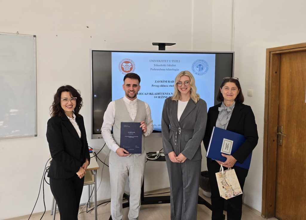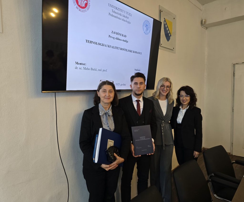 Dana 10.10.2025.godine, na studijskom programu Prehrambena tehnologija (usmjerenje Prehrambena tehnologija) kolega Muhamed Bekrić uspješno je odbranio završni rad prvog ciklusa studija. Kolega Muhamed Bekrić je odbranio rad pod nazivom “Tehnologija i kvalitet roštiljske kobasice”, pred Komisijom za odbranu u sljedećem sastavu: Dr.sc. Milica Vilušić, red. prof., predsjednik Dr.sc. Tijana Brčina, red. prof., zamjenski član MA Amela […]