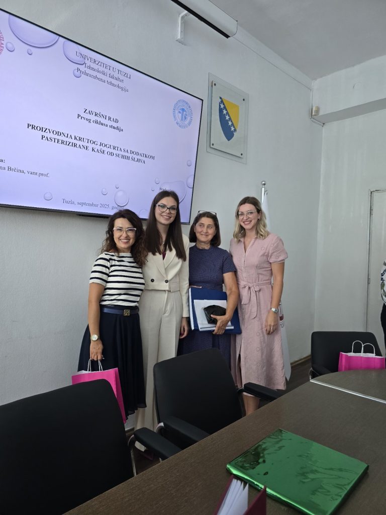 Dana 10.10.2025.godine, na studijskom programu Prehrambena tehnologija (usmjerenje Prehrambena tehnologija), kolega Ahmed Ahmetović uspješno je odbranio završni rad prvog ciklusa studija. Kolega Ahmed Ahmetović je odbranio rad pod nazivom˝Utjecaj skladištenja na parametre svježine meda˝ pred Komisijom za odbranu u sljedećem sastavu: Dr.sc. Milica Vilušić, red. prof., predsjednik Dr.sc. Tijana Brčina, red. prof., mentor MA Amela Kusur, […]
