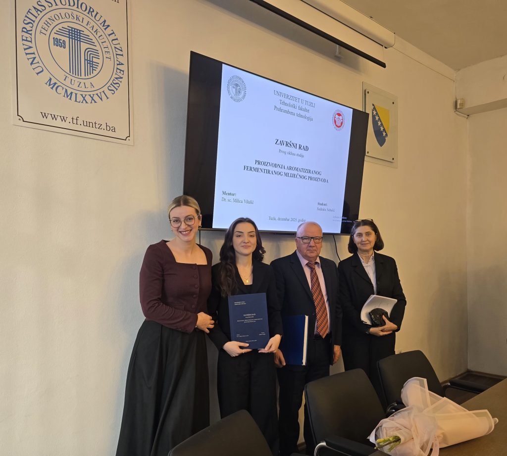 Dana 19.12.2025. godine na studijskom programu Prehrambena tehnologija (usmjerenje Prehrambena tehnologija), naša kolegica Sadmira Subašić uspješno je odbranila završni rad prvog ciklusa studija pod nazivom “Proizvodnja aromatiziranog fermentiranog mliječnog proizvoda” pred Komisijom za odbranu u sljedećem sastavu: – Dr.sc. Meho Bašič, redovni profesor, predsjednik – Dr.sc. Milica Vilušić, redovni profesor, mentor – MA Amela Kusur, viši asistent, član. Našoj kolegici upućujemo […]