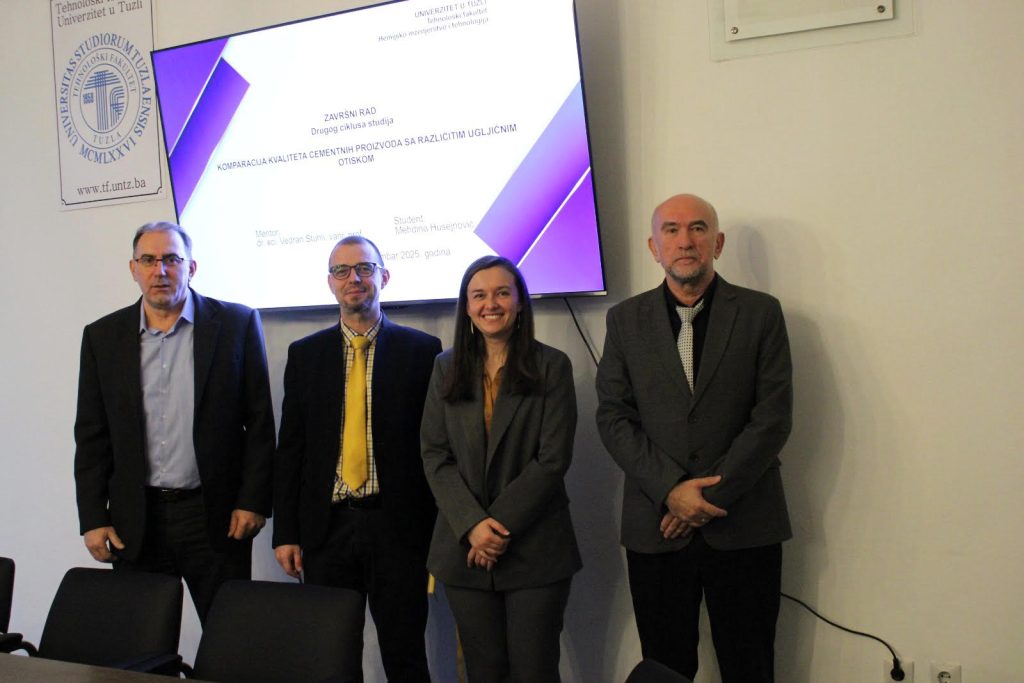 Dana 26.12.2025. godine na drugom ciklusu studija – studijski program Hemijsko inženjerstvo i tehnologija, usmjerenje Hemijsko inženjerstvo, naša kolegica Mehdina Husejnović, bachelor-inženjer hemijskog inženjerstva i tehnologije, uspješno je odbranila svoj završni magistarski rad pod nazivom „Komparacija kvaliteta cementnih proizvoda sa različitim ugljičnim otiskom“, pred Komisijom za odbranu u sljedećem sastavu: Dr. sc. Zehrudin Osmanović, […]