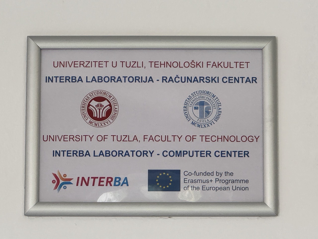 INTERBA Laboratorija-Računarski Centar je uspostavljena na Tehnološkom fakultetu Univerziteta u Tuzli sa svim završnim radovima i instalacijom opreme u 2024. godini, a kompjuterska oprema je nabavljena u sklopu Erasmus+ INTERBA projekta “INTERnationalization at Home: Embedding Approaches and Structures to Foster Internationalization at Western BAlkans”.