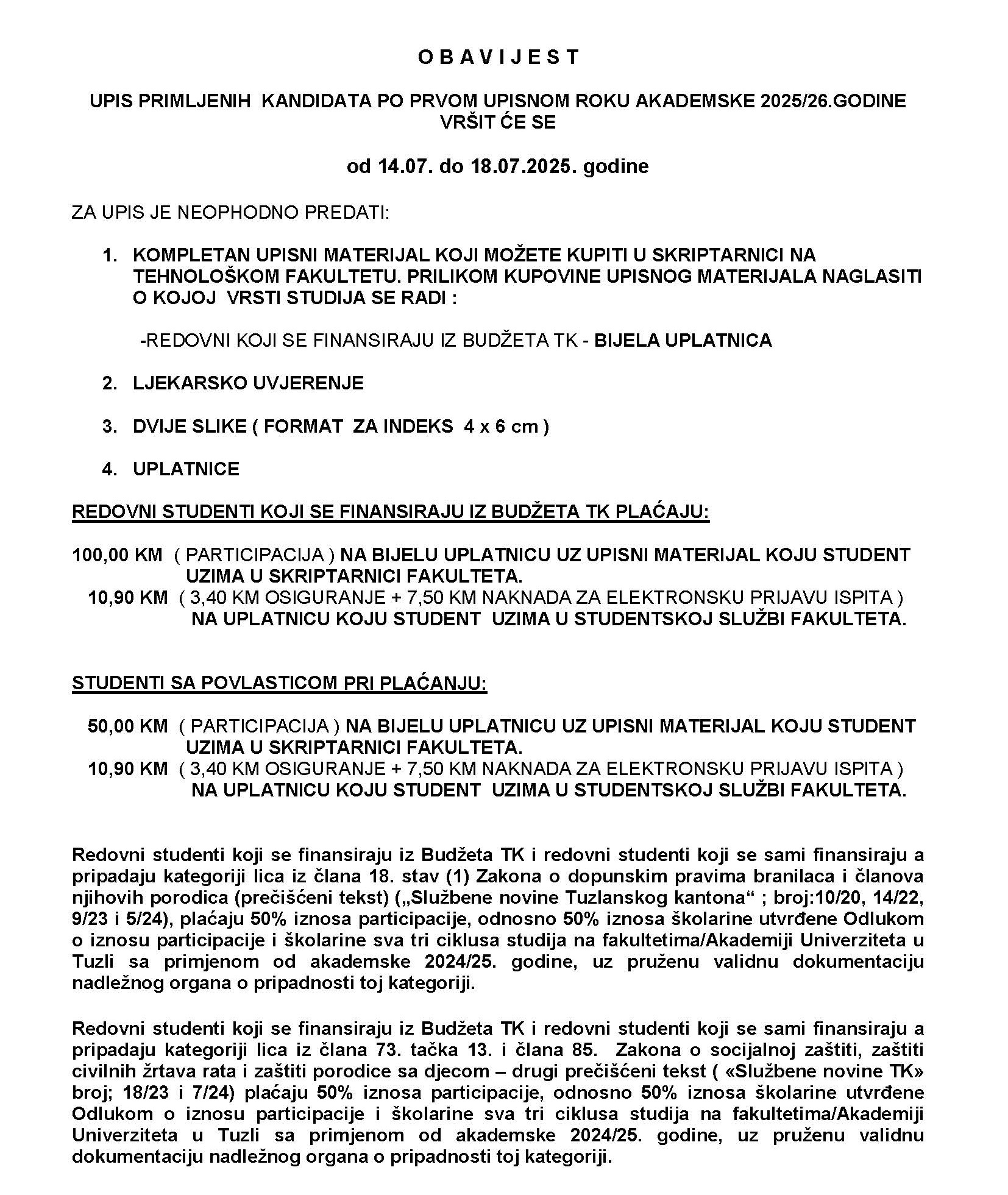 Konačna rang-lista kandidata koji su ostvarili pravo upisa u prvom upisnom roku na Tehnološkom fakultetu u ak.2025/26. godini i Obavijest o upisu primljenih kandidata