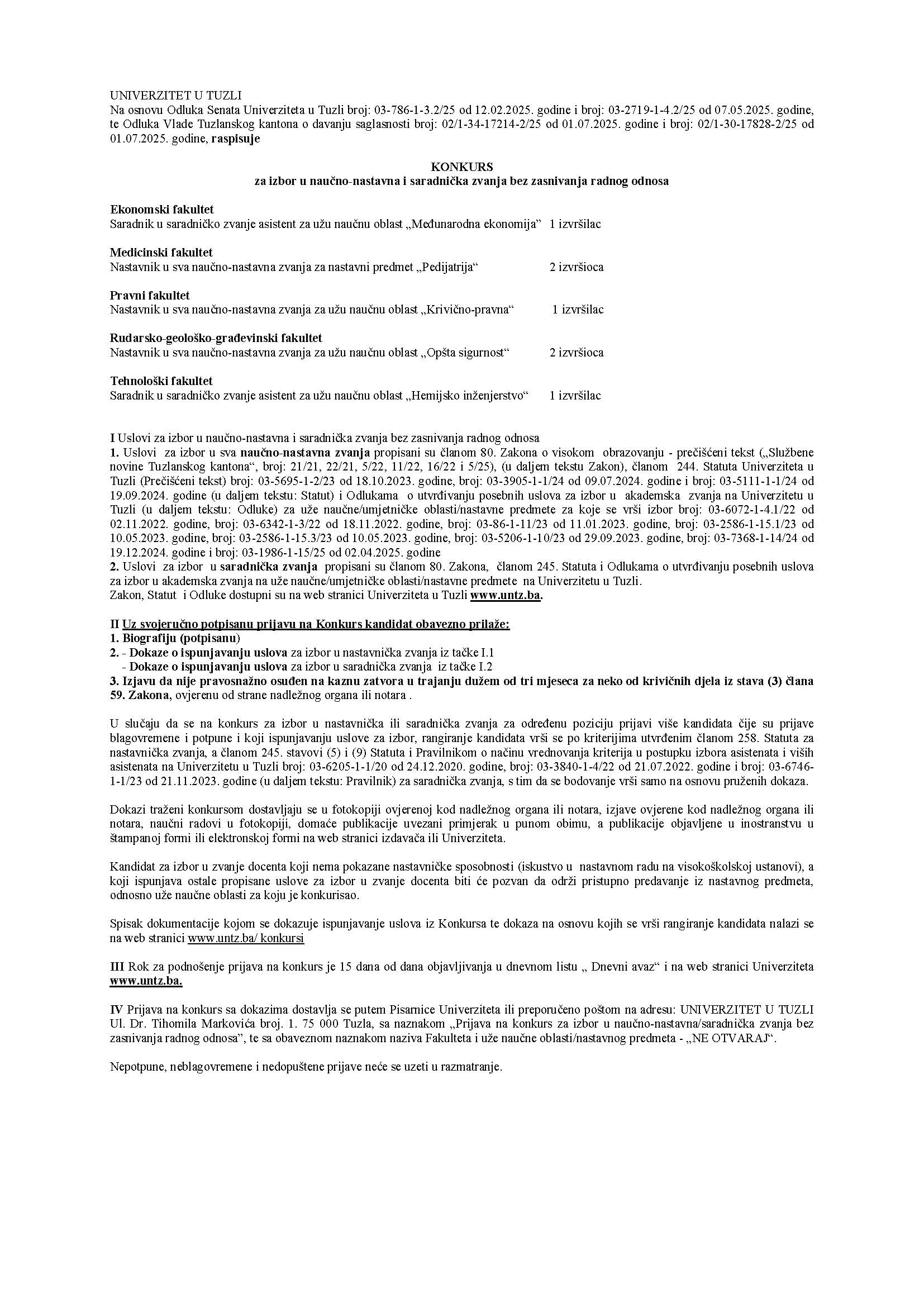 KONKURS za izbor u naučno-nastavna i saradnička zvanja bez zasnivanja radnog odnosa