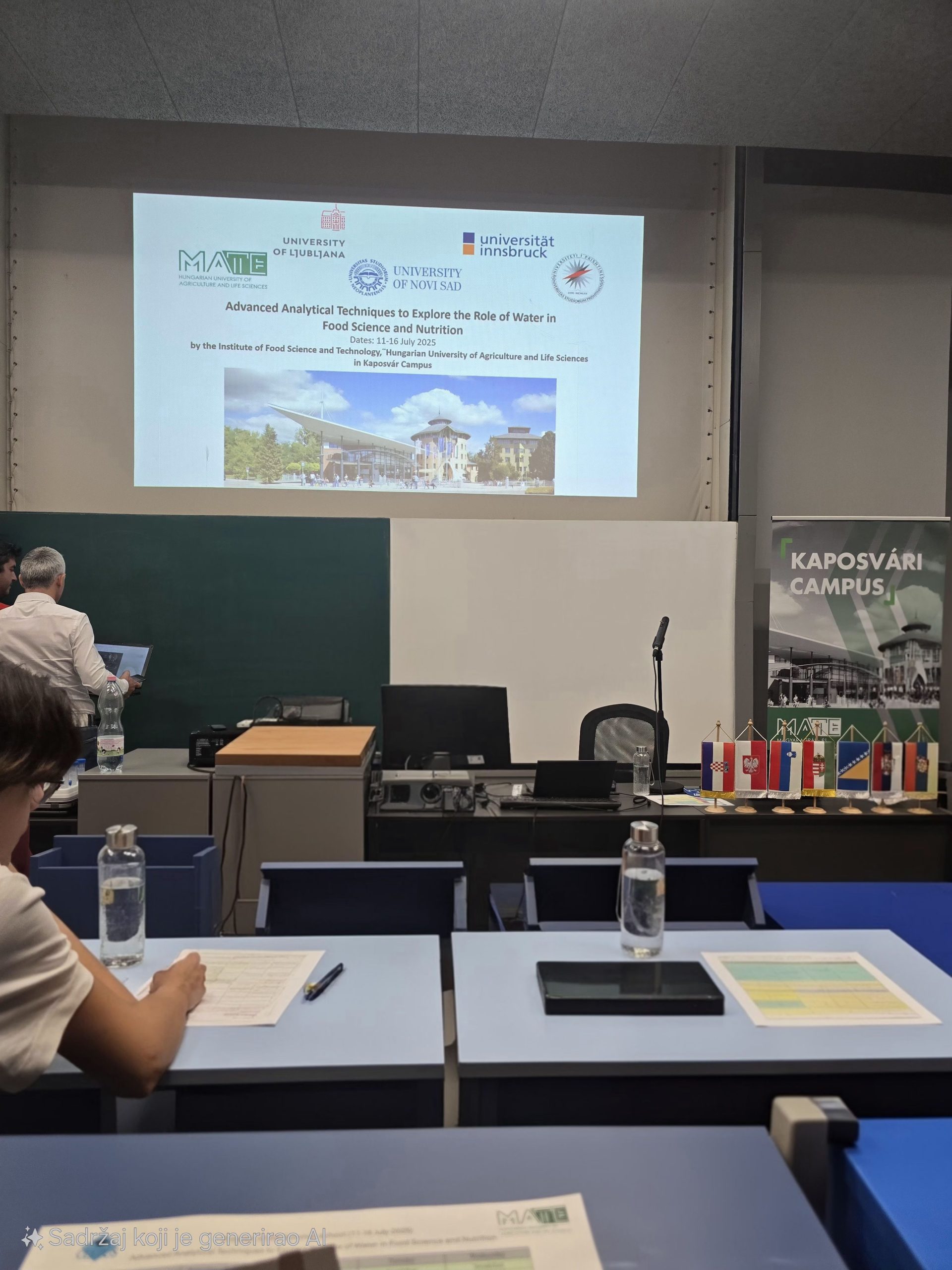Student treće godine odsjeka prehrambena tehnologija Emir Hajdarević i naše asistentice Sedina Hodžić i Amela Kusur su u periodu od 11.-16.07.2025. godine učestvovali na ljetnoj školi pod nazivom “Advanced Analytical Techniques to Explore the Role of Water in Food Science and Nutrition”, koja se održala u Kapošvaru, Mađarska.