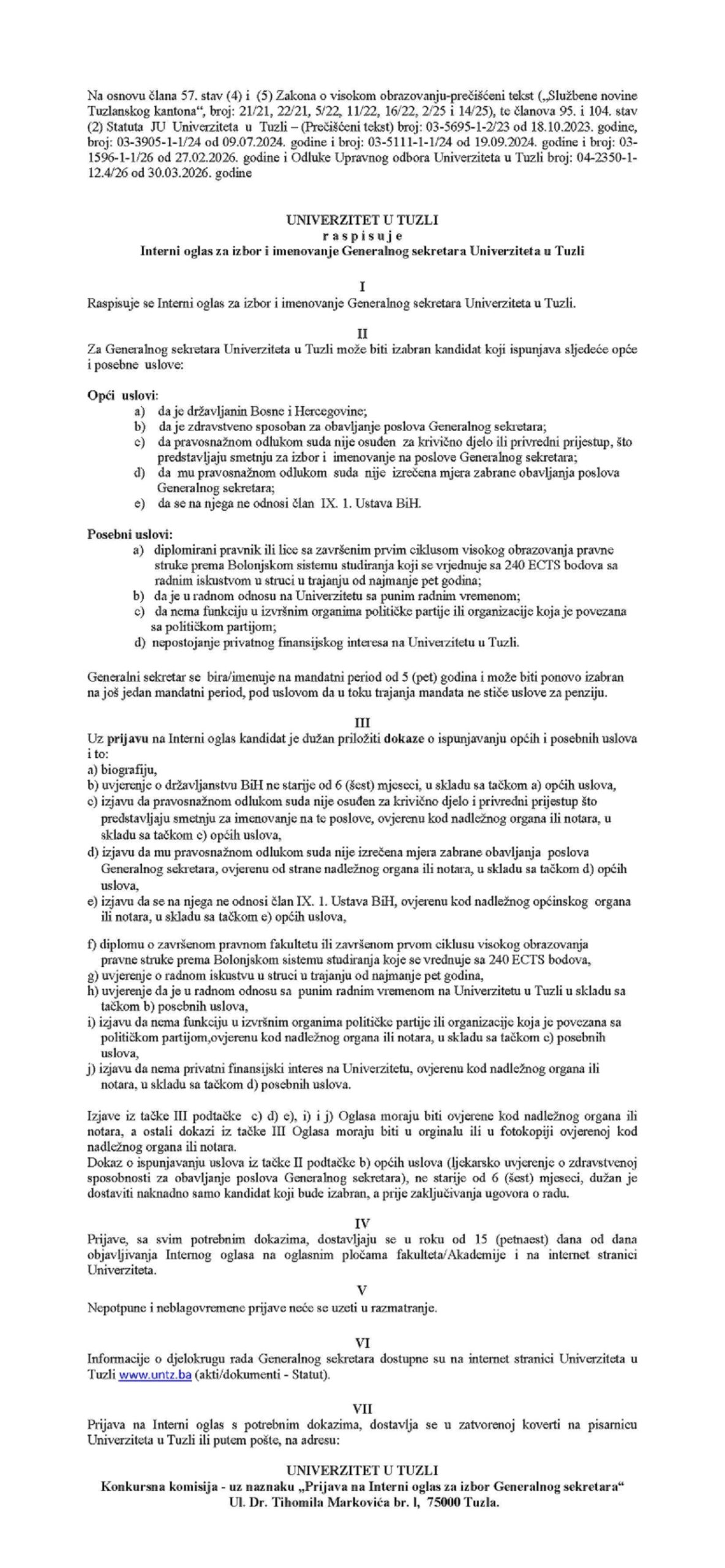 Interni oglas za izbor i imenovanje Generalnog sekretara Univerziteta u Tuzli