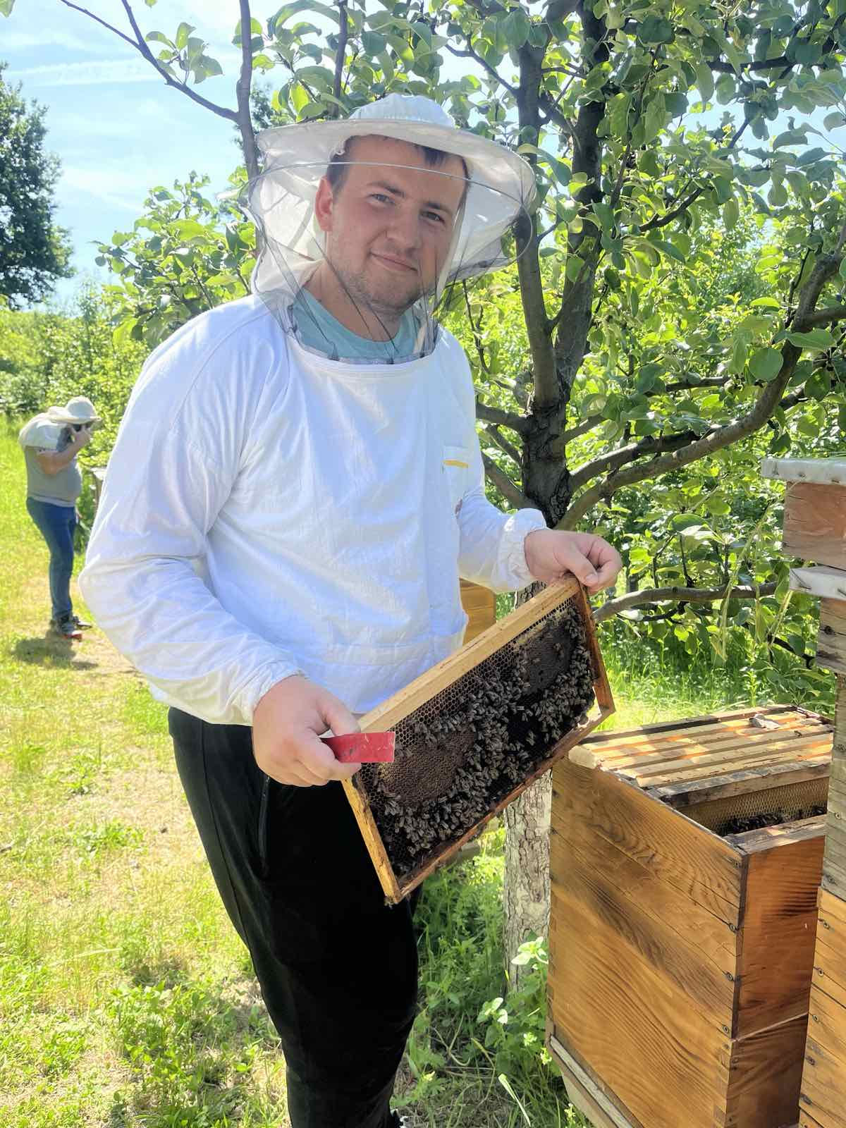 Naši domaćini, Nermin Sinanović i njegova supruga, pripremili su za studente zanimljivu pokaznu vježbu oduzimanja i vrcanja meda. Tokom ove praktične radionice, studenti su aktivno sudjelovali u grupama i imali priliku iz prve ruke upoznati cijeli proces proizvodnje meda. Zahvaljujući predanom radu i strpljenju domaćina, naši studenti su osjetili kako izgleda jedan dan u životu pčelara – od nektara iz biljke do slatke poslastice koja nastaje u saću.