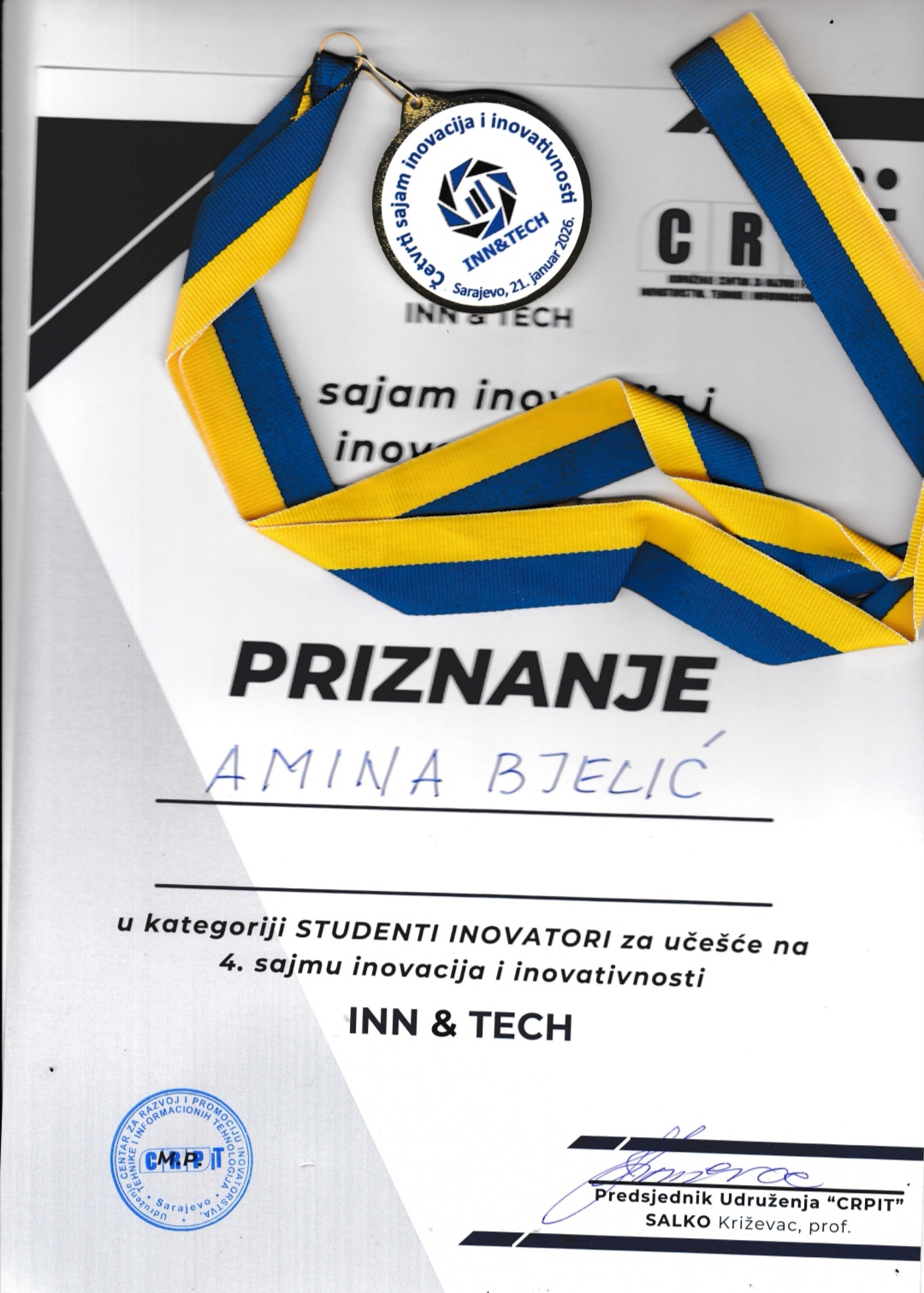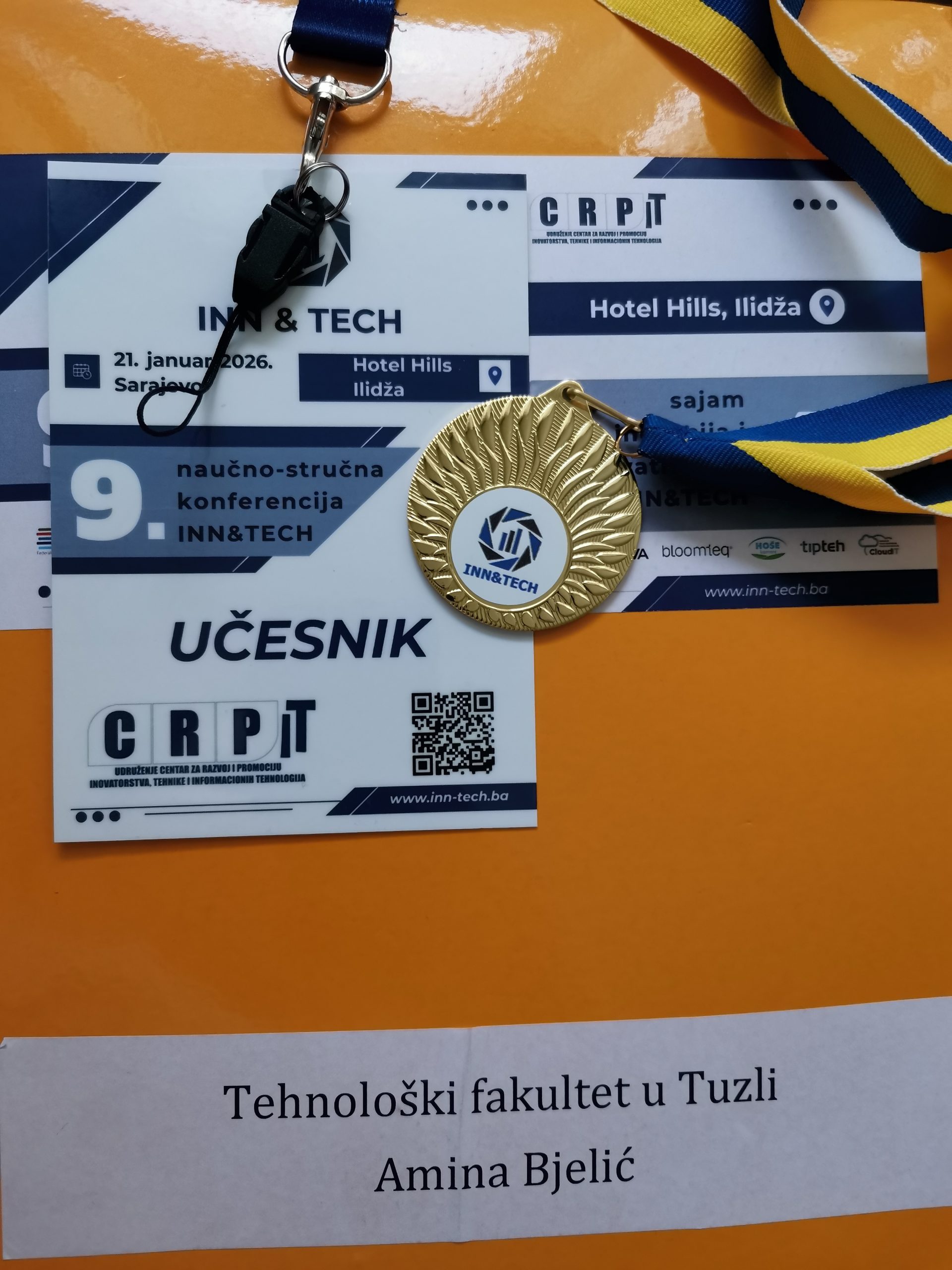 Dana 21.01.2026. godine studentica Amina Bjelić sa studijskog odsjeka Hemijsko inženjerstvo i tehnologija učestvovala je na 4. Sajmu inovacija i inovativnosti INN&TECH, Sarajevo. Cilj skupa je razvijanje i podizanje opće svijesti o značaju tehnike, tehnologije, tehničke kulture, inovativnosti, inovatorstva i IT tehnologije za društveni interes, kao i da se izvrši sinergija obrazovnog, privrednog i naučnog sektora, a sve u cilju konkurentnog i ekonomski stabilnog društva.